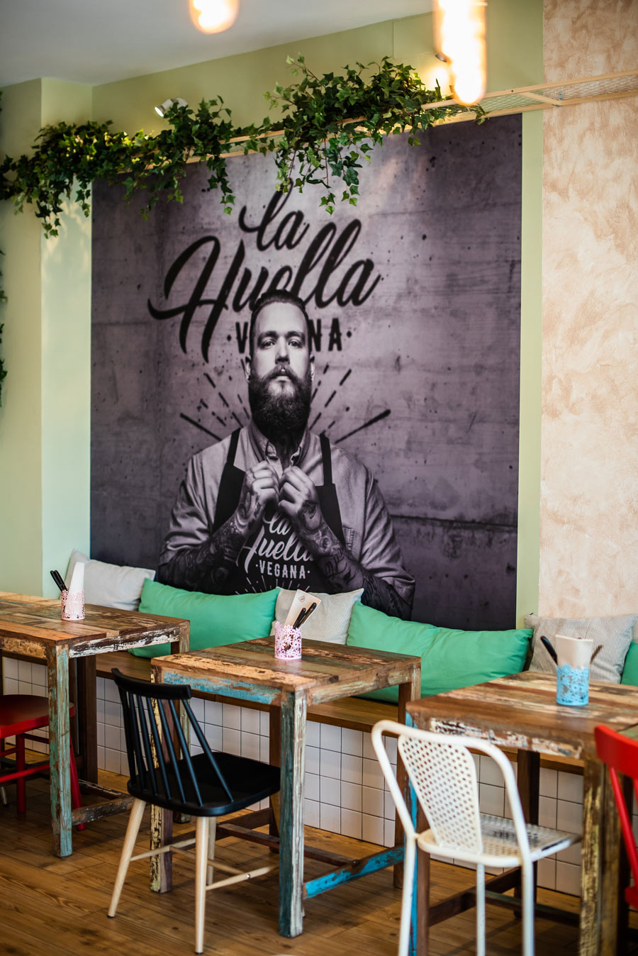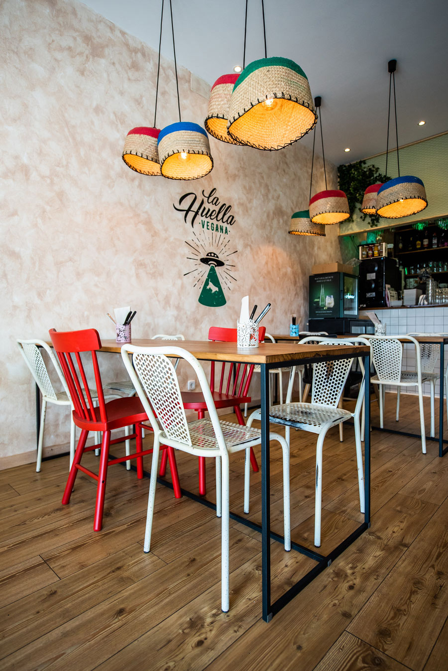 Proyecto y supervisión de la reforma del local a partir del proyecto de interiorismo. Implantación de la nueva imagen de la franquicia de restauración La Huella Vegana en un local en Las Rozas de Madrid